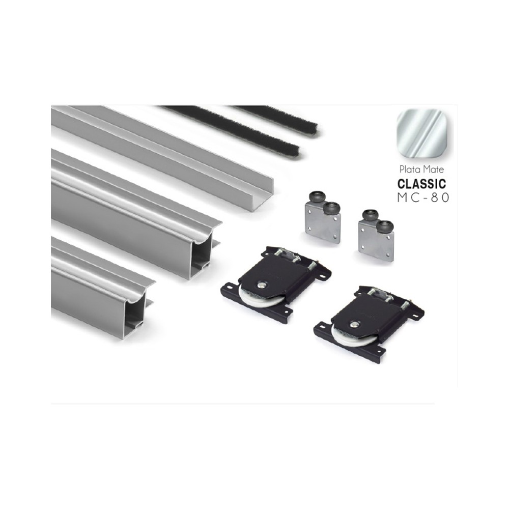 Kit de perfiles tiradores de puerta corredera apoyada para tablero de 16 mm, diseñado para ofrecer una solución práctica y estética. Con rodamientos de deslizamiento suave y silencioso.
